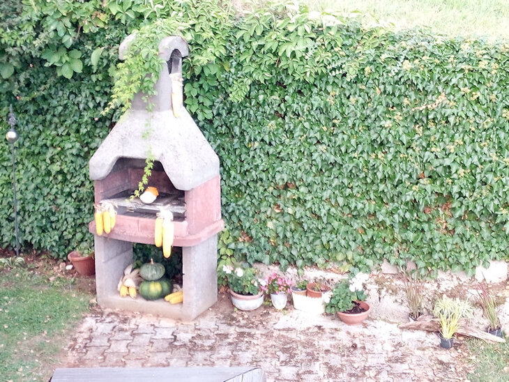 Outdoor space with terrace, garden, barbecue, seating and games areas.