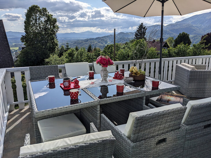 A large South facing terrace with views of the valley below and majestic alpine mountains. Several seating and dining areas on the terrace and in the garden for both sunshine and shade along with a BBQ area for those alfresco meals.